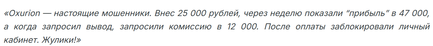 Один из пользователей в своем отзыве про Oxurion Pro рассказывает, что пополнил баланс на $300. Через несколько дней менеджер потребовал внести еще $700 под угрозой блокировки депозита. Когда трейдер отказался, его счет на сайте просто обнулили.