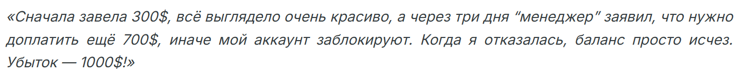 Еще один клиент сообщил, что внес 25 тыс. рублей на эту «биржу». Когда он попытался вывести средства, скамеры потребовали «комиссию» 12 тыс., а затем заблокировали личный кабинет.