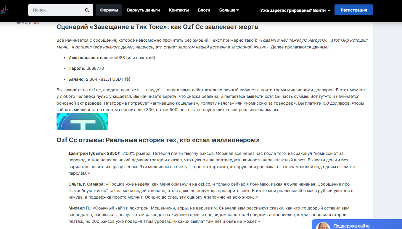 Хотя домен сайта зарегистрировали еще в 2021 году, данную площадку на него загрузили лишь в конце 20025 года. Именно тогда появились первые жалобы на кошелек ozf cc.