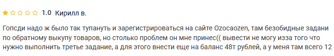 Еще один посетитель сайта заявляет в отзыве о Ozocaozen ru, что скамеры заблокировали вывод «до выполнения третьего задания». Чтобы к нему приступить, следовало пополнить баланс в личном кабинете на 48 тыс. руб.