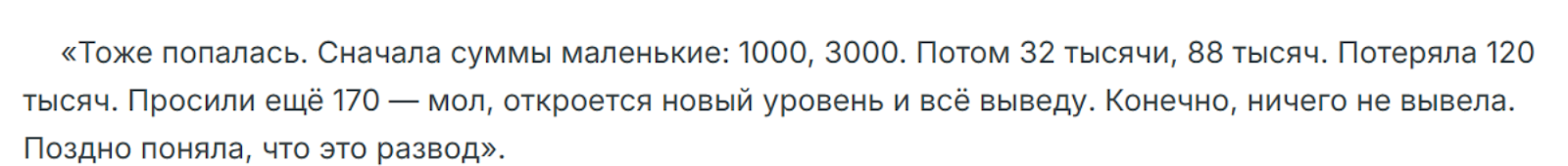 - Показывая пользователю фиктивный заработок, скамеры требовали от него вносить новые суммы. Однако вывести заработанные средства ни у кого не получилось.