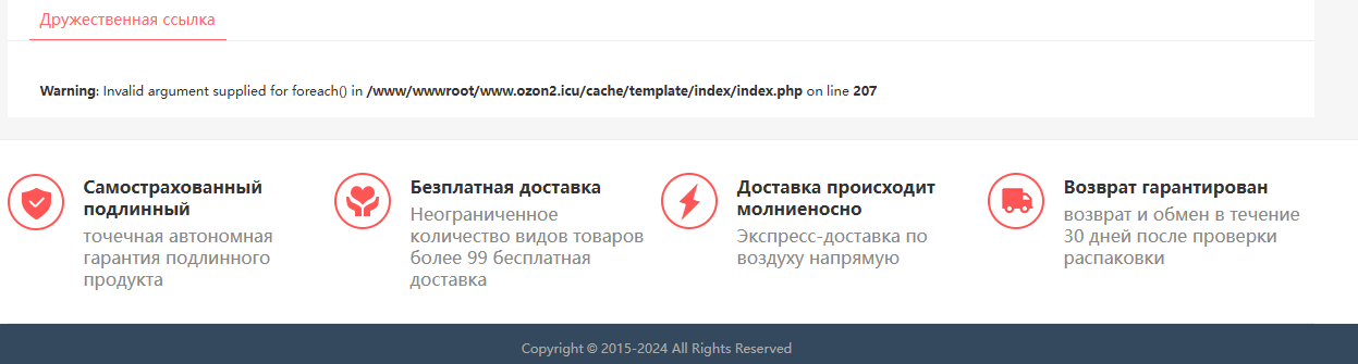 Но это совершенно не останавливает разработчиков, они указывают в футере 2015 год запуска. При этом если платформу в действительности пытаются выдать за известный маркетплейс, то совершенно неясно почему отмечен именно 2015 год, ведь Озон значительно старше, он был запущен в 1998 году.