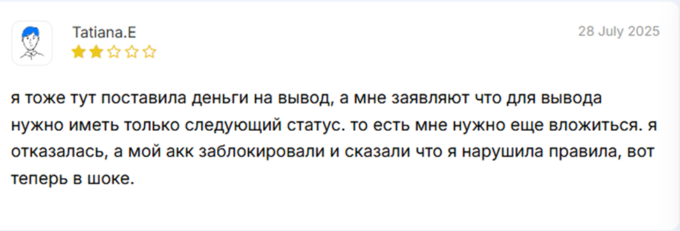Очередной псевдоинвестиционный проект, маскирующийся под программу лояльности, на деле оказывается банальной схемой обмана. Пользователи, привлеченные обещаниями баллов за отзывы, сталкиваются с блокировкой аккаунтов и аннулированием накопленных бонусов без объяснения причин. Продавцы, в свою очередь, становятся жертвами мошенников, которые заказывают товары, оставляют формальные отзывы ради баллов, а затем возвращают покупки, оставляя продавцов с убытками. В результате, вместо взаимовыгодного сотрудничества, участники получают лишь разочарование и финансовые потери. Рекомендую держаться подальше от подобных «акций» и не поддаваться на заманчивые, но пустые обещания.
