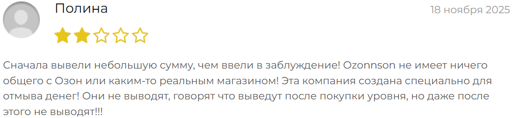 В интернете есть несколько отзывов от тех, кто пострадал из-за Ozonnson ru, все они негативные. Пользователи подтверждают, что их деньги были украдены.