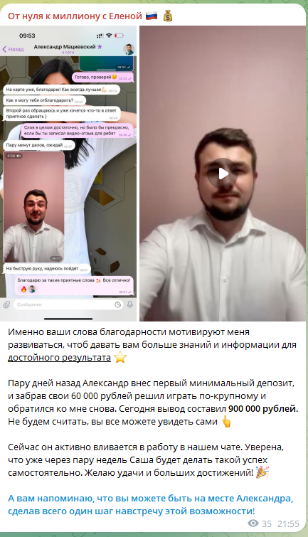 Данил периодически выставляет видеоотзывы от довольных пользователей. Но доверия этот формат не вызывает. Так, например, человек с одного из роликов был «довольным клиентом» уже на самых разных каналах, связанных с мошенничеством: