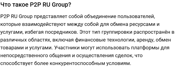 Проект P2P RU Group вызывает серьезные сомнения: отсутствие официального сайта, контактов и реальных отзывов делает его крайне ненадежным. Единственная найденная статья больше продвигает другую биржу, чем предоставляет информацию о самом проекте. Без прозрачности и подтвержденной репутации доверять такому сервису рискованно.