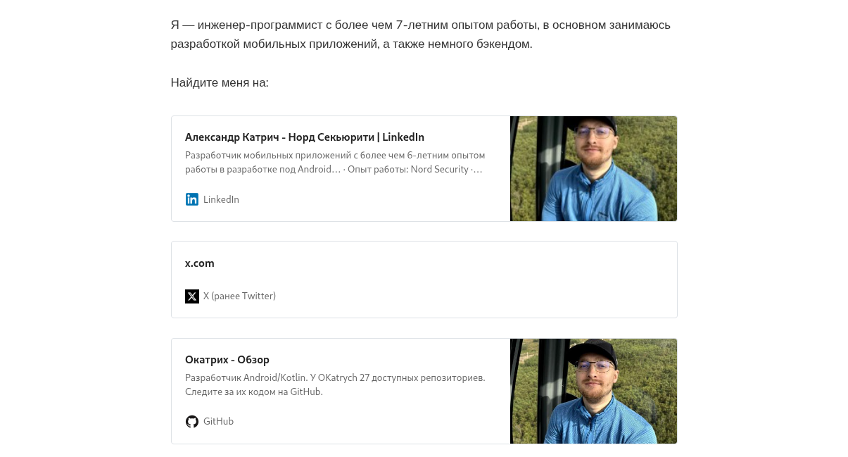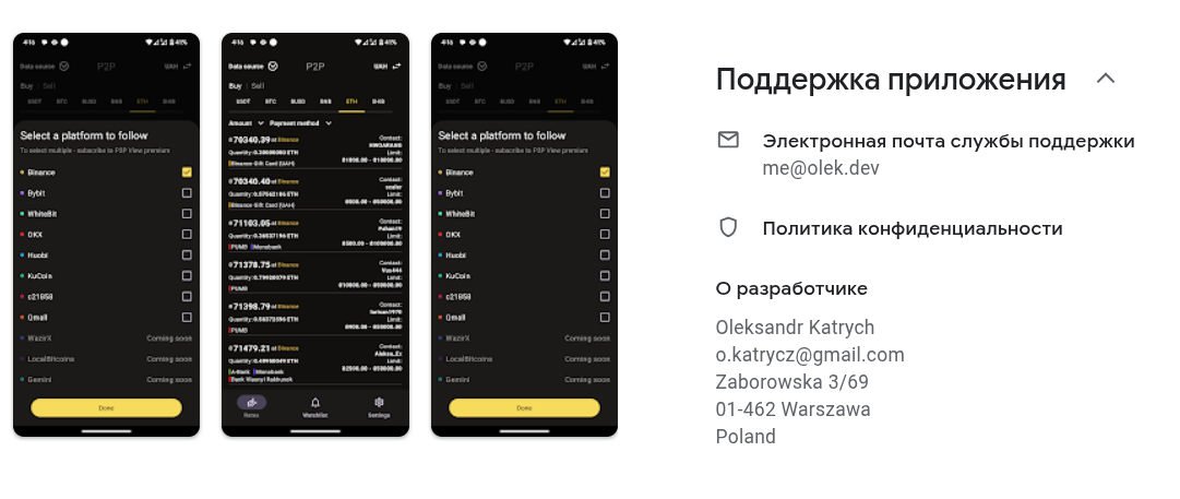 В отличие от классических скам-проектов, где команду прячут за выдуманными именами, здесь мы видим вполне реальных людей. В App Store разработчиком указан Yehor Chernenko, а в Google Play за продукт отвечает Oleksandr Katrych. У последнего даже можно найти профили на LinkedIn и GitHub, что подтверждает: код писали живые программисты, а не анонимные мошенники.