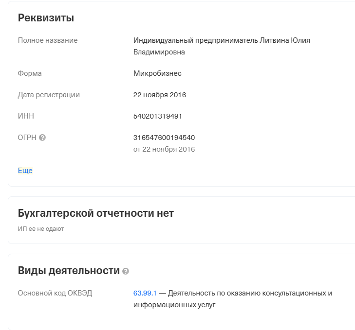 При этом заметим, что автор зарегистрирована в качестве ИП Литвина Ю.В. Проверка показала, что эксперт была зарегистрирована только в 2016 году, а ОКВЭД для образовательной деятельности у нее нет. Информации о других регистрациях нет. Это может быть негативным фактором.