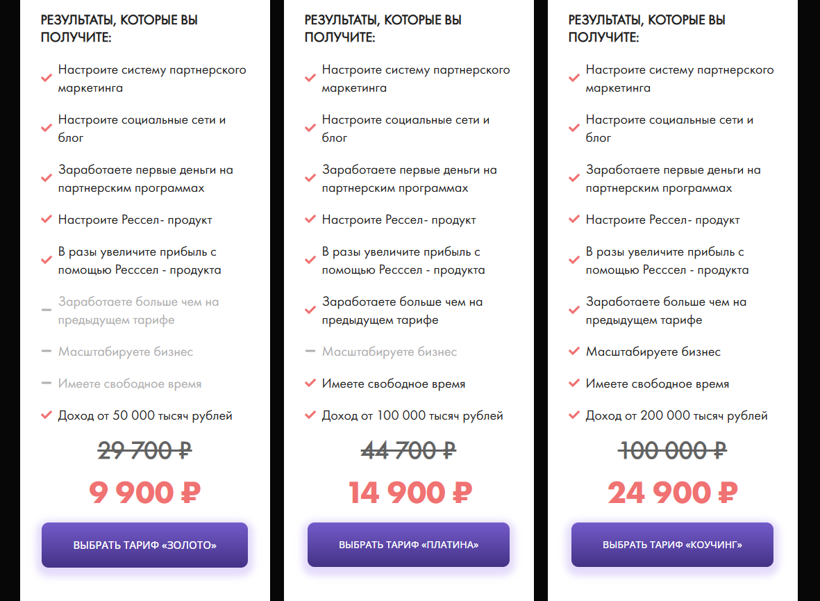 Программа представлена в трех тарифах: Золото, Платина и Коучинг. В зависимости от выбора тарифа пользователям гарантируется разный уровень дохода. Так, в самом дорогом тарифе Коучинг ученикам обещают выход на доход от 200 тысяч рублей. Однако заметим, что обещания выхода на конкретный доход зачастую дают недобросовестные авторы.