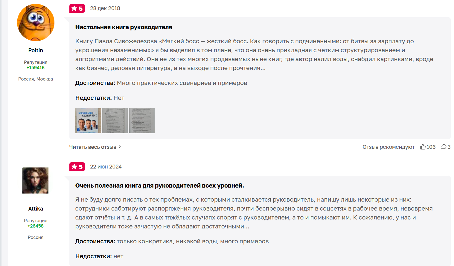 Клиенты пишут, что курсы интенсивные, а объемы большие, но если прилагать усилия, то можно многому научиться. Отдельно упоминается книга «5 Шагов от мягкого босса к жесткому», которую некоторые читатели называют настольным учебником для руководителей.