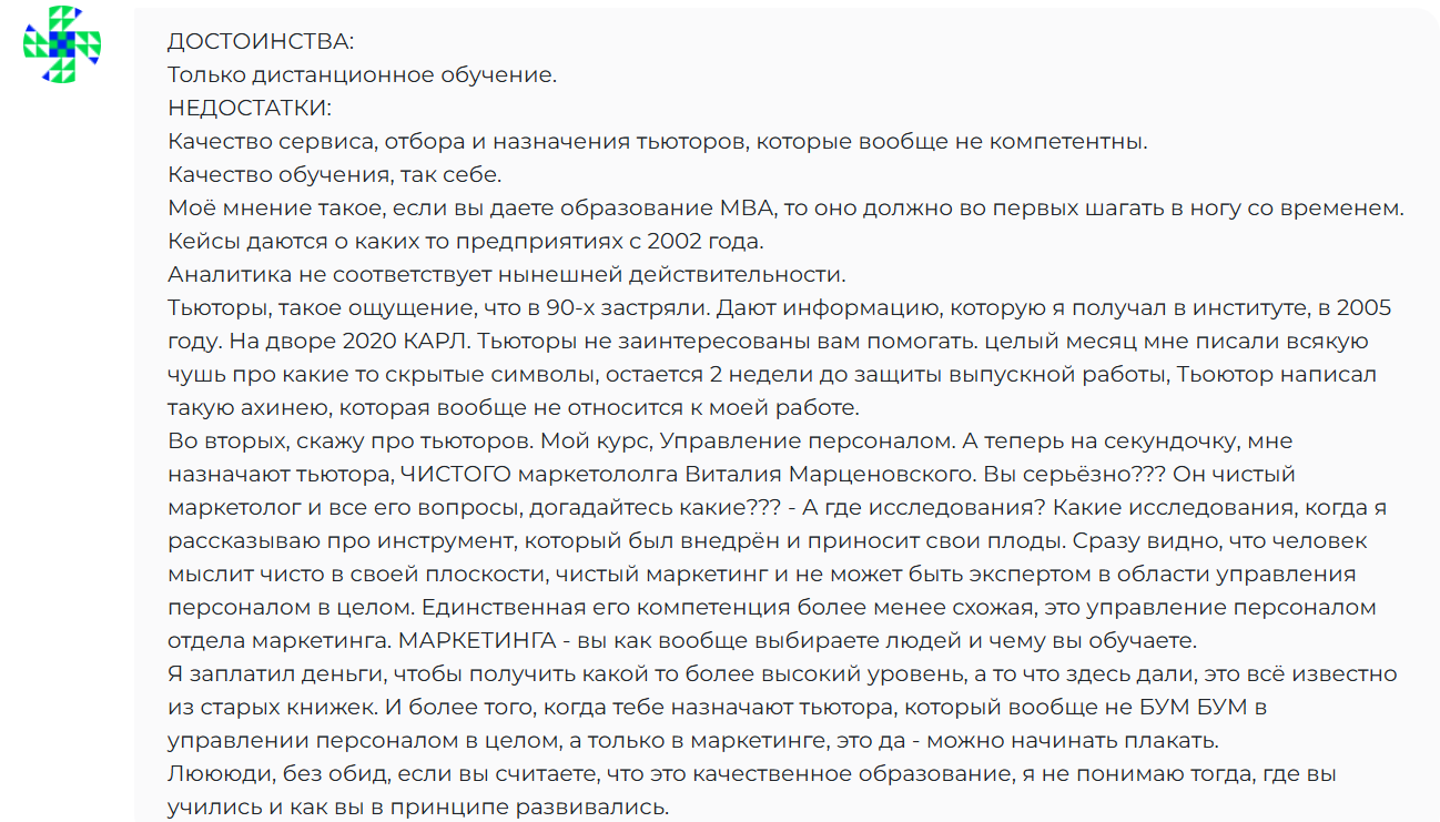 Но есть и другая сторона отзывов, где клиенты говорят, что обучение устаревшее, кейсы из начала 2000-х, а аналитика неактуальная. Некоторые слушатели возмущены подбором тьюторов и тем, что консультации Павла Сивожелезова не совпадают с ожиданиями.