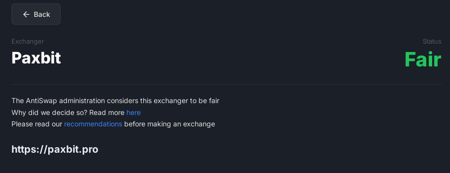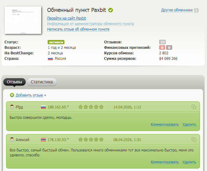 - положительные отзывы про обменник Paxbit находятся на одном сайте. Репутация честного ресурса не подтверждена из-за отсутствия откликов за весь год работы Паксбит.