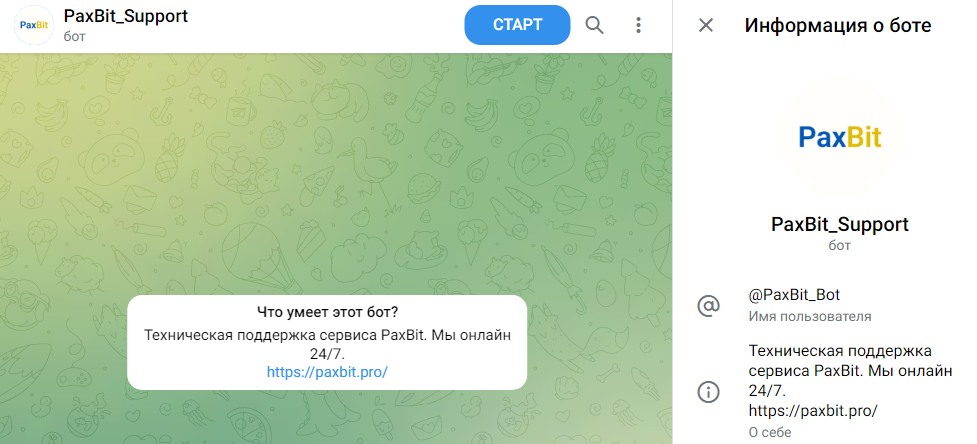 В футере сайта указан адрес электронной почты, он является валидным. Также у проекта есть бот PaxBit Bot для связи с техподдержкой.