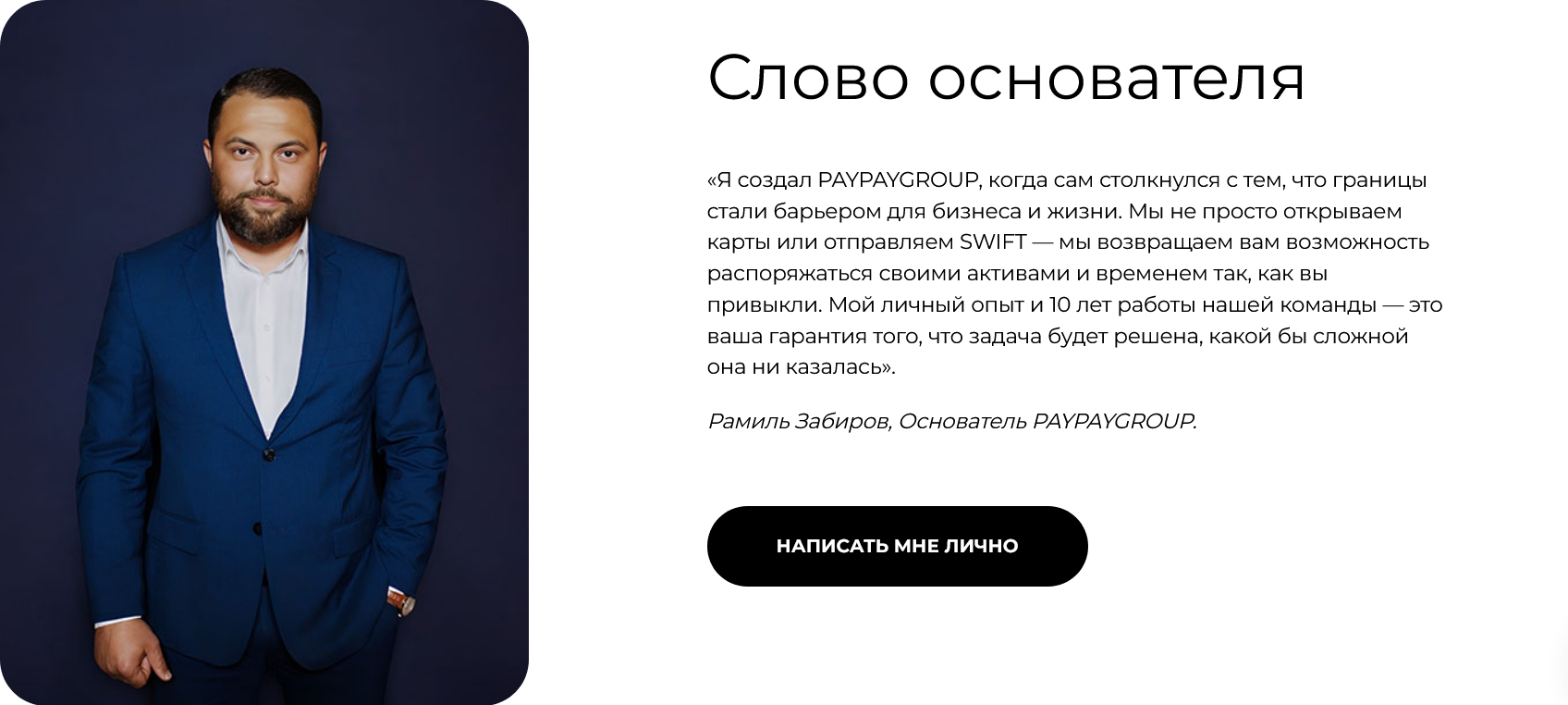 Создал компанию Рамиль Забиров, немного информации о котором есть на сайте платежной системы. В разделе «Слово основателя» написано, что когда мужчина понял, что для бизнеса и жизни существуют границы, он решил создать данный проект.