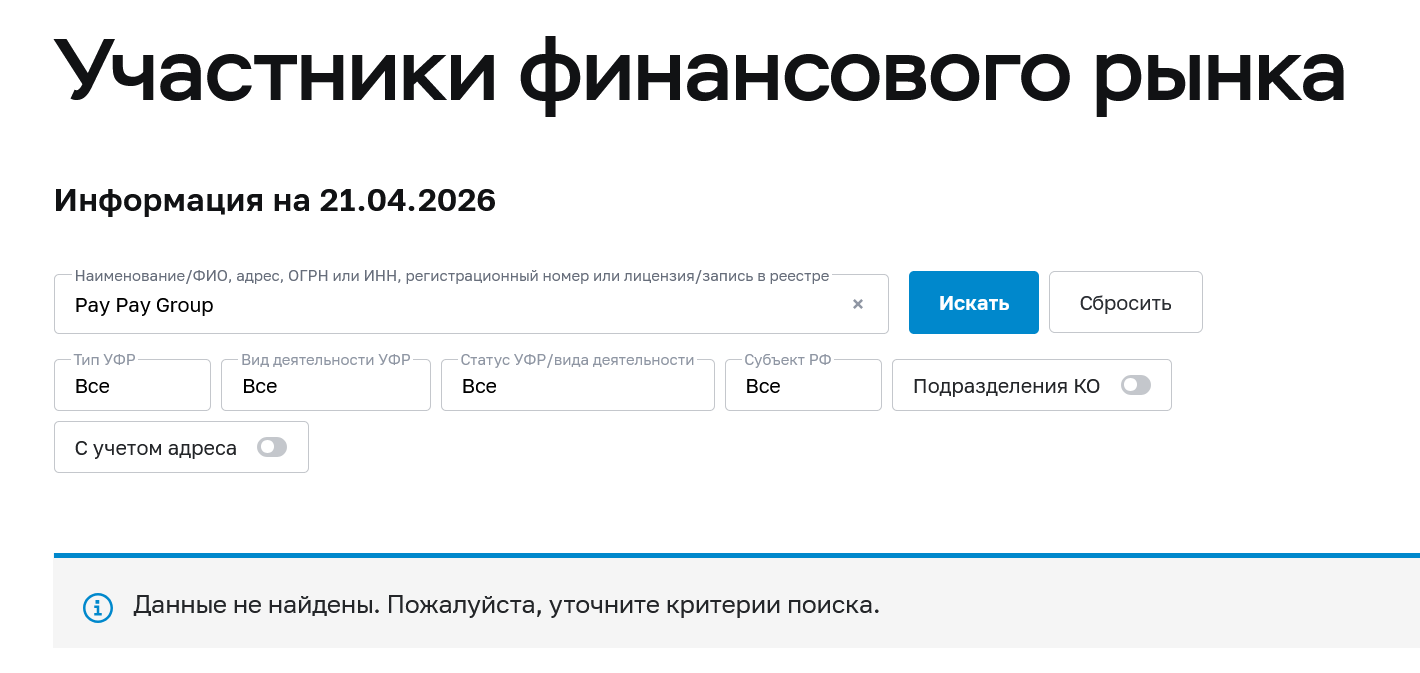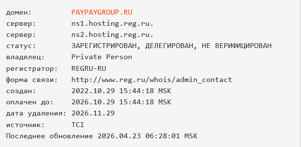 Также на сайте указано, что компания работает более 10 лет, однако проверка домена paypaygroup ru показала, что регистрация была проведена в октябре 2022 года.