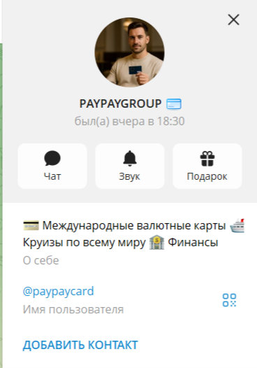 Служба поддержки «Пэй Пэй Кард» представлена аккаунтом в Телеграмм, график работы не указан.