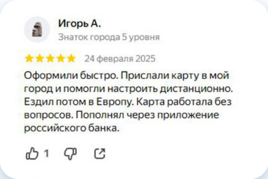 На сайте платежной системы размещены только положительные отклики клиентов, взятые с тематической платформы «Яндекс. Отзывы». Люди пишут, что карту оформили дистанционно и быстро, доставили в город клиента.