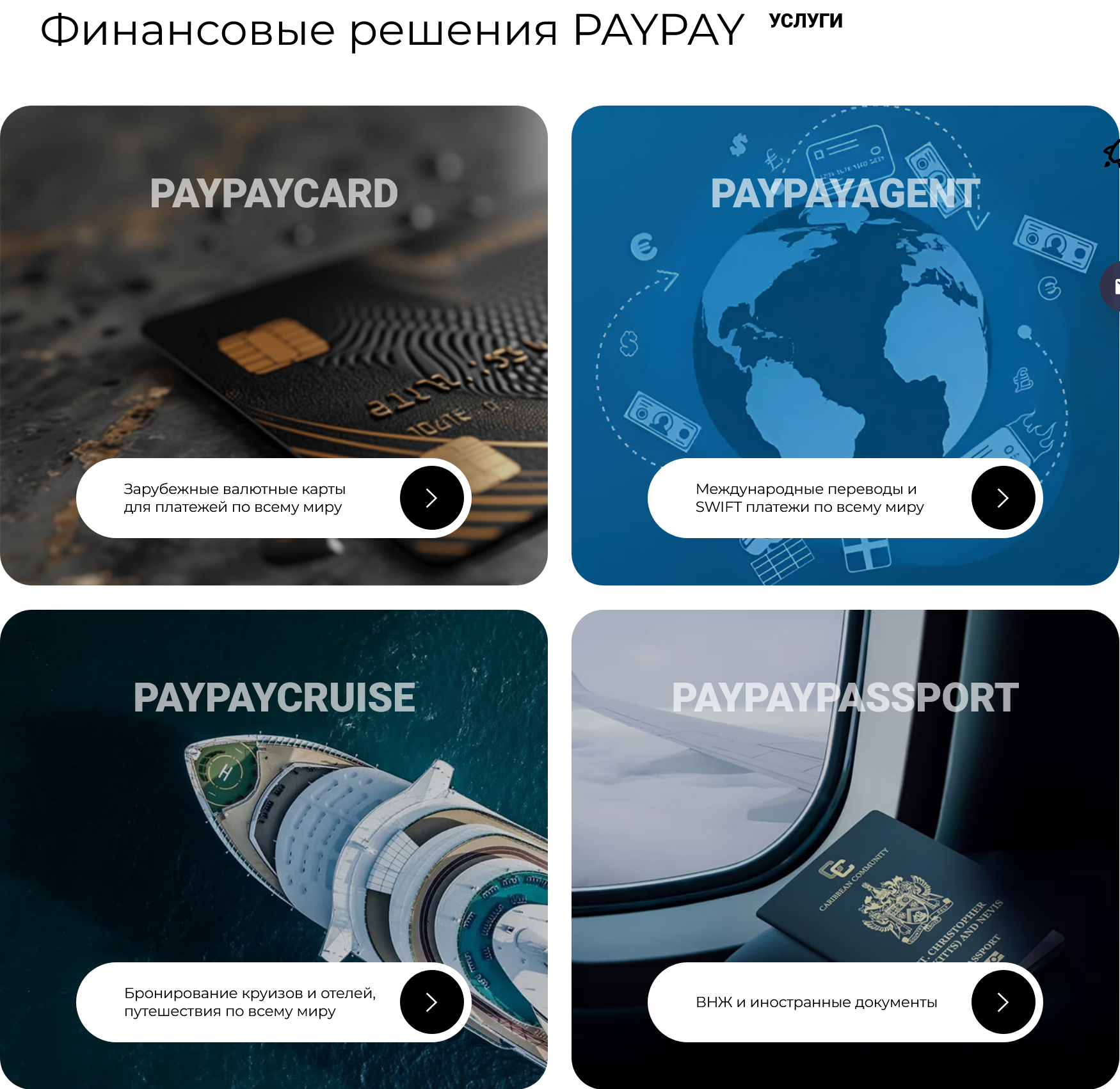 На сайте указано, что проект Pay Pay Group ru включает в себя не только карту, но и следующие финансовые услуги: