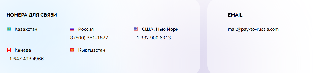 Компания Pay to Russia Com имеет представителей в разных странах: с проектом можно связаться по номерам телефона США, России, Канады и других государств. Для обращений также есть электронная почта. Проверка показала, что e-mail и вправду существующий.