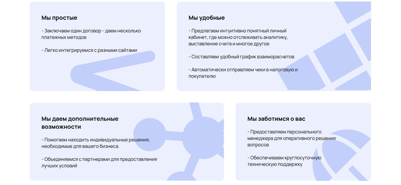 Второй блок с преимуществами чуть побольше. Итак, проект простой — один договор для всех платежных методов. Систему легко встроить в любой бизнес. Удобство — проект интуитивно понятен, поэтому не надо тратить много времени на изучение.