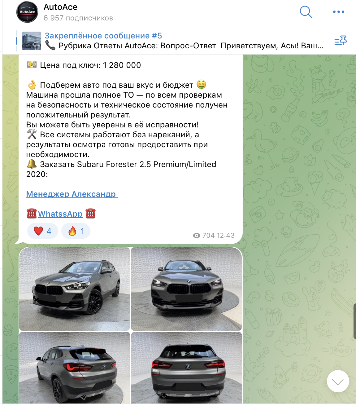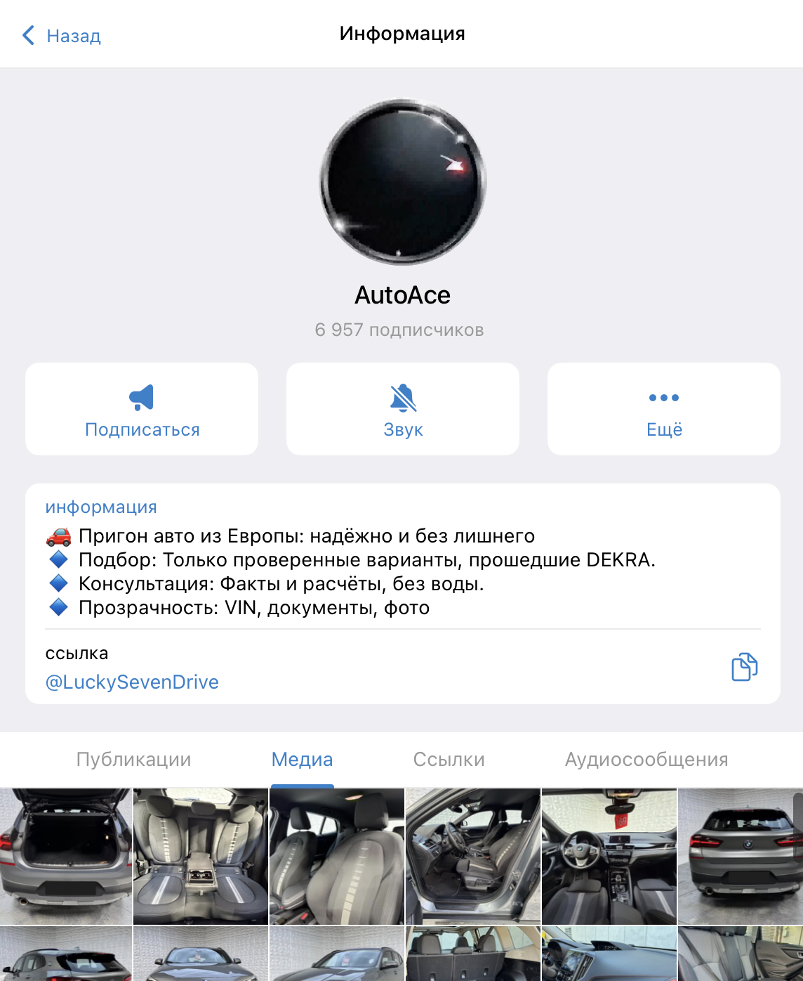 Тг проект Auto Ace с ником LuckySevenDrive работает в сфере автомобильных услуг в русскоязычном сегменте. Он специализируется на подборе и пригону б/у машин“под ключ”. Обещает доставку за 5–8 дней “по месту вашего жительства”. Отметим, что коммуникация с менеджерами доступна через WhatsApp, а в постах фигурируют их имена – Александр и Олег.