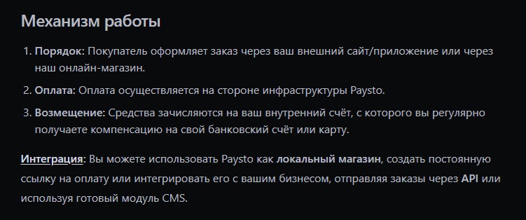 Механика работы имеет четкий производственный цикл. Клиент интегрирует свои продажи с платформой через API или готовые модули для популярных CMS. Покупатель совершает оплату через шлюз Paysto. Средства зачисляются на внутренний счет компании в системе.