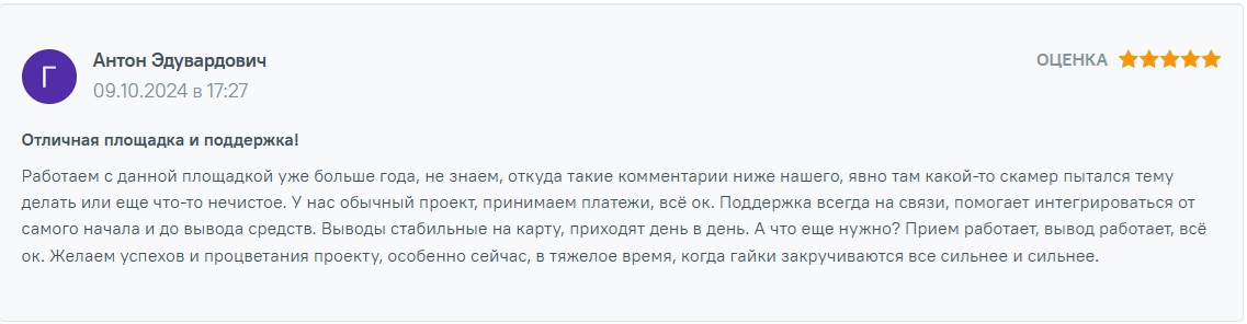 Положительные отзывы обычно исходят от клиентов, которые успешно интегрировались. Они ценят избавление от бюрократии, стабильность выплат и работу поддержки. Например, пользователь Антон Эдуардович отмечает, что вывод средств происходит день в день, а помощь в интеграции была полной.