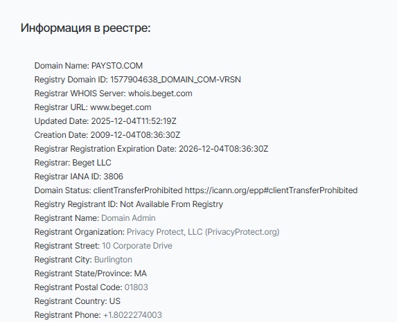 На сайте указан московский адрес офиса. Но данных о том, под какой именно российской компанией работает сам сервис Paysto, в открытом доступе нет.