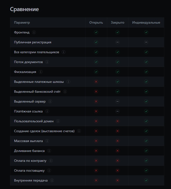 Цена услуги формируется индивидуально. Она зависит от выбранного тарифного плана — «Общедоступный», «Изолированный» или «Индивидуальный». На стоимость влияют объём оборотов, необходимость в выделенных шлюзах или серверах. Все детали согласовываются персонально с менеджером.
