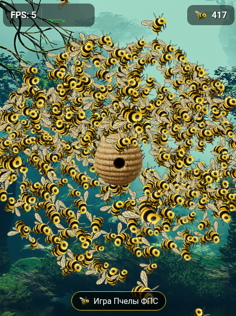 - Функционал теста — вылет пчел при зажатии экрана и отображение FPS в углу экрана.