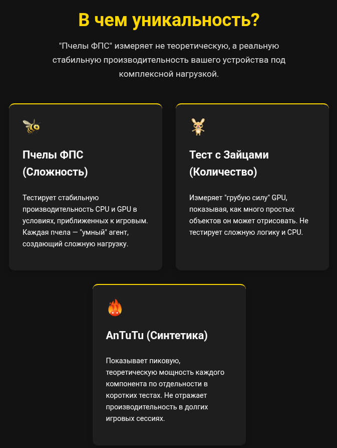 Пчелы ФПС — бот в ТГ для проверки производительности смартфона в условиях высокой нагрузки на железо. Разработчики Пчелы ФПС тест позиционируют его как инструмент для измерения реальной стабильной нагрузки на CPU и GPU, а не заявленной производителем.