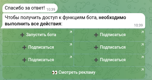 Этот бот — сплошная замануха: подписки на левые каналы, бесполезные мини-игры и никакой реальной пользы. Только время зря потратил.