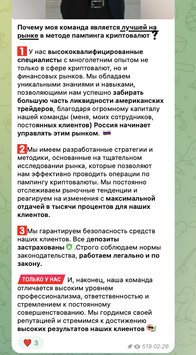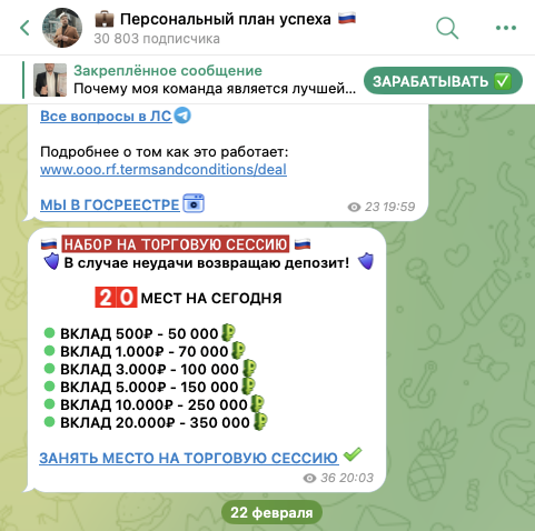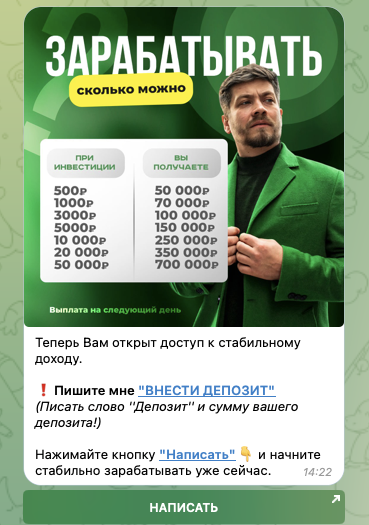 Владелец тг-канала предлагает подписчикам передавать ему деньги, обещая увеличить вложения до 100 раз менее чем за сутки. Минимальная сумма, с которой с ним можно начать работать, составляет всего 500 рублей.