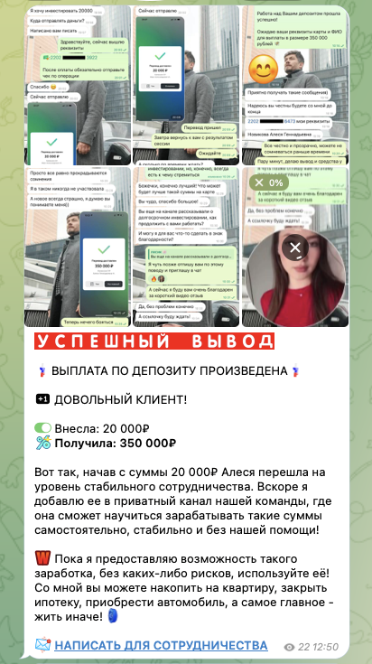 Также админ выкладывает скриншоты переписок с клиентами. В них контрагенты активно благодарят за возможность заработать.