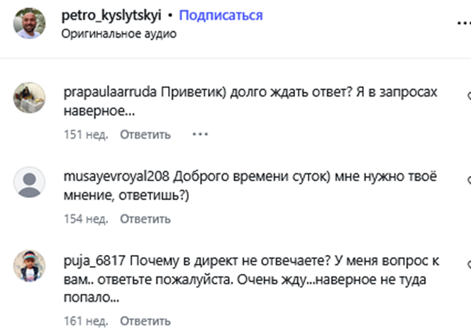 Независимые отзывы о работе проекта Petro Kyslytskyi не найдены. Комментирование на Ютубе отключено, ознакомиться с мнением слушателей нельзя. Трейдер ведет группу в Инстаграм, предлагает услуги через ТГ. Но количество публикаций сравнительно небольшое, иногда встречаются запросы от читателей канала. Однако Кислицкий не отвечает своим подписчикам, реакций на их вопросы нет.