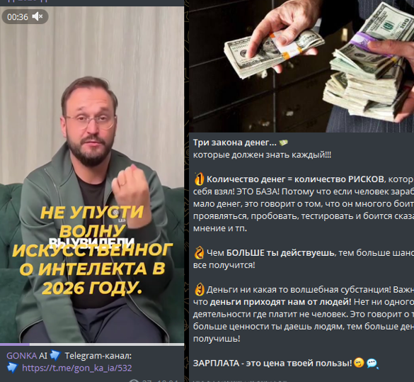 В описании персонального аккаунта в Телеграмм дает ссылки на Gonka AI. Запись сопровождается призывами не упускать возможность заработать на нейросетях уже сейчас.