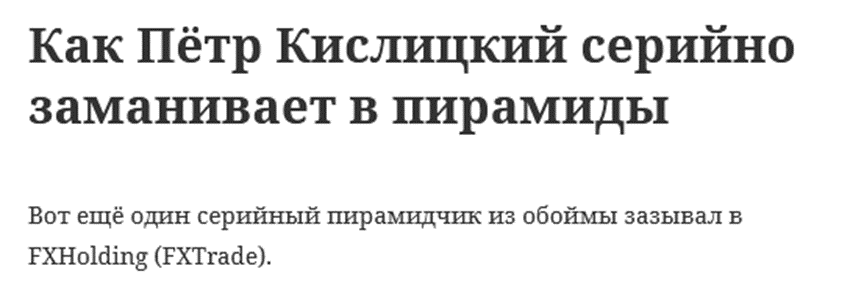 Пётр Кислицкий – трейдер, предлагающий высокие заработки на торгах. Активно ведет социальные сети, имеет канал на Ютуб, где регулярно публикует новые обзоры. Известен тем, что завлекает пользователей в работу пирамид, например, FXTrade. Независимых отзывов о его работе не найдено, но общее мнение о трейдере в результате оценки складывается плохое.