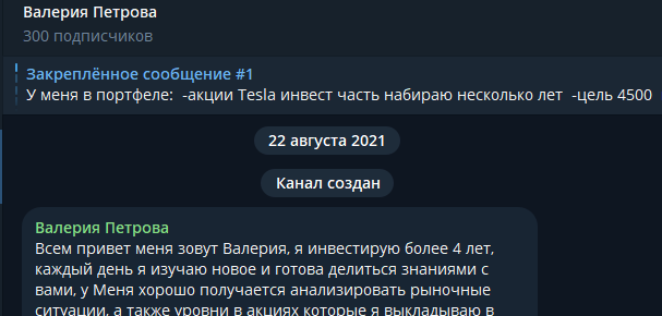 Более того, если пролистать до создания канала в 2021-м году, то видим, что Petrova Lera уже тогда заявляла об опыте более 4 лет. Каким образом за 4 года ничего не изменилось – неясно. Опираясь на первый пост, автор инвестирует уже более 8 лет, а не 5.