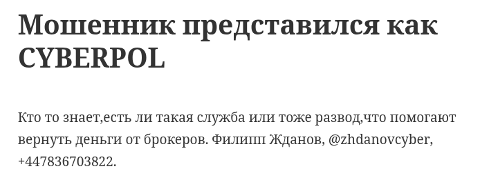 Филипп Жданов позиционирует себя как сотрудника международной организации CYBERPOL и предлагает спасение тем, кто уже пострадал от действий лжеброкеров или крипто мошенников.
