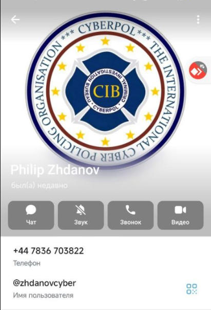 Легенда скамера под ником Philip Zhdanov (@zhdanovcyber) рассчитана на людей в состоянии стресса и паники. На его аватаре красуется логотип CYBERPOL (The International Cyber Policing Organization) – реально существующей международной организации. В профиле указан британский номер телефона (+44 7836 703822), что должно придавать солидности и создавать иллюзию работы с зарубежной юрисдикцией. Кажется, вот оно – решение проблем. Но именно на этом доверии к брендам и строится весь развод.