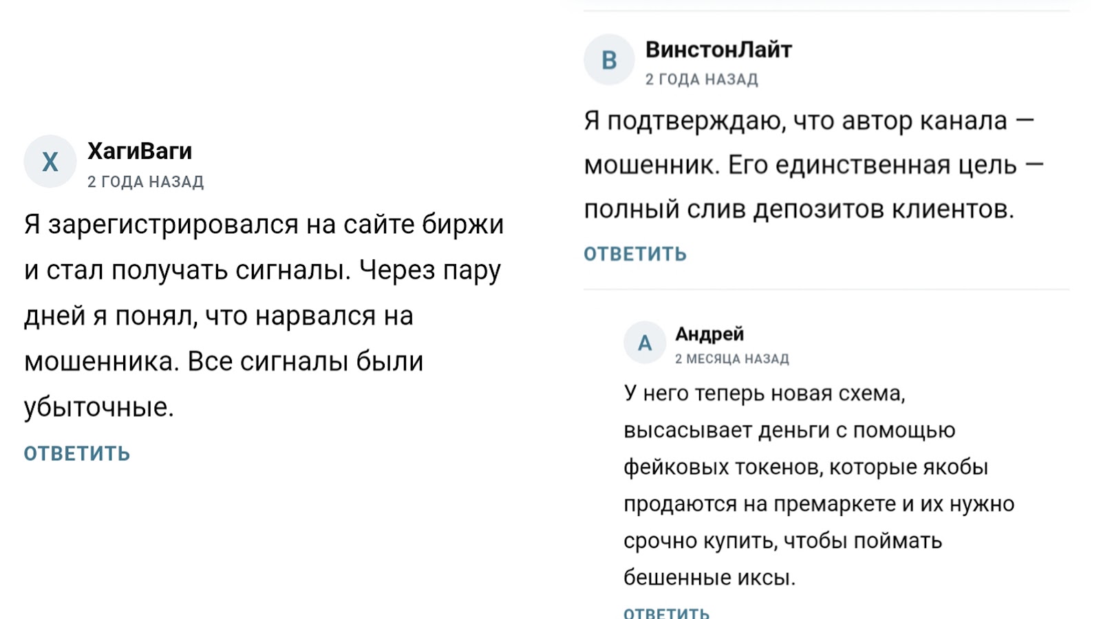 Как пишут клиенты, предоставленные сигналы оказались убыточными, и, помимо этого, трейдер продвигает фальшивые токены, из-за которых можно потерять средства.
