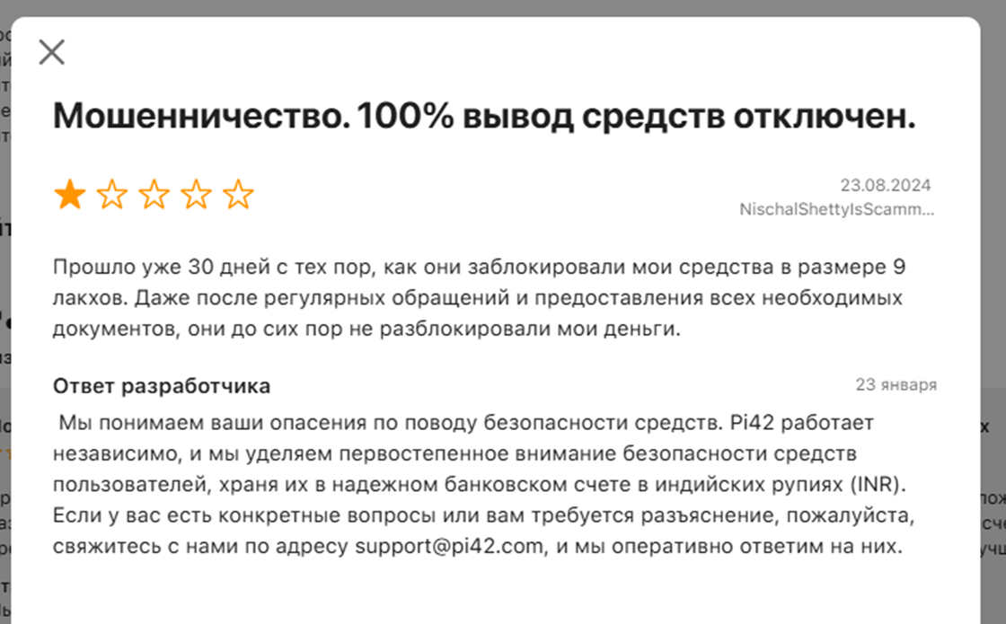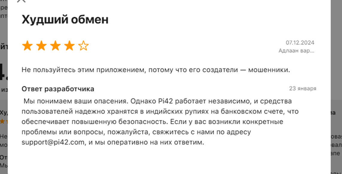 На Pi42 отзывы противоречивые. Ряд трейдеров отмечает скорость работы приложения и биржи в целом, а также ее удобство для покупки крипты.