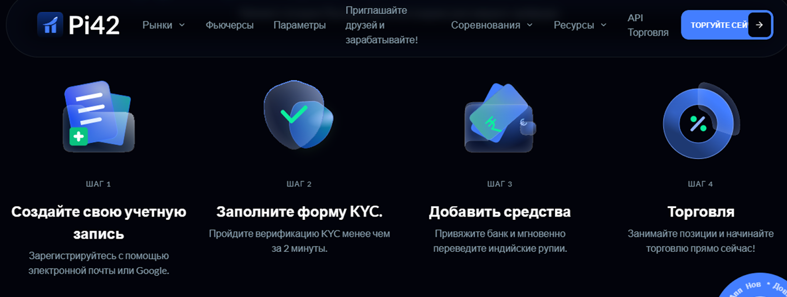 На Pi42India дана короткая инструкция для новых трейдеров. Для получения доступа к рынкам, следует пройти регистрацию и КУC верификацию. Обещано, что создание аккаунта отнимет не более 2-х минут.