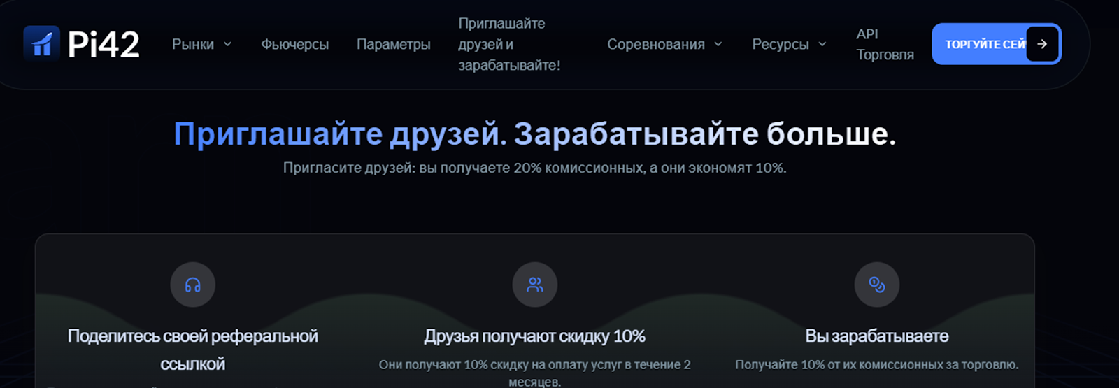 Есть на Pi42 com и реферальная программа. Участникам, которые приводят друзей, обещаны начисления в размере 10% от комиссий рефералов. А новым пользователям, пришедшим в рамках партнерки, дается 10-процентная скидка на комиссию.