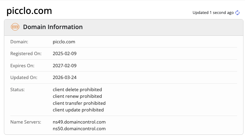 Первое, что указывает на то, что picclo com может быть скамом – дата создания сайта. Хотя домен зарегистрирован в начале 2025 года, апдейт произошел только 24 марта 2026 года.
