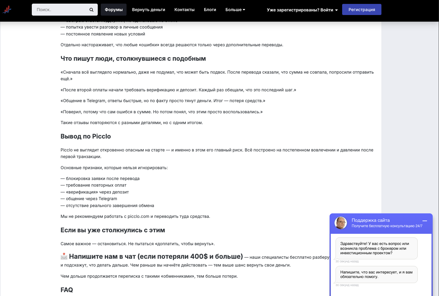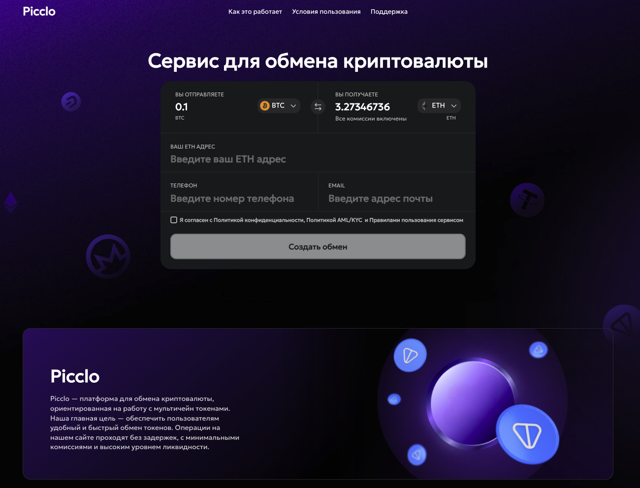 Picclo – криптовалютный обменник, создатели которого заявляют о том, что с его помощью пользователи могут получить доступ к быстрому и безопасному обмену цифровых активов. При ближайшем рассмотрении работы площадки можно увидеть, что работать с сервисом потенциально опасно. В обзоре предоставим доказательства этому.