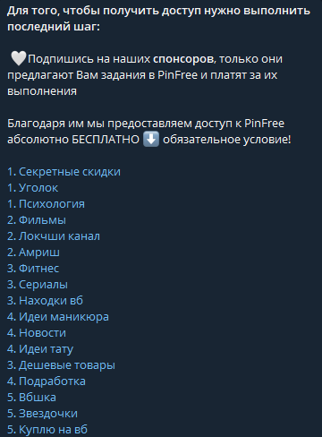 Пользователь приходит по реферальной ссылке, бот спрашивает об устройстве и о наличии аккаунта Pinterest, после чего сообщает, что приложение «ПинФри» готово к подключению. Дальше начинается обязательный шаг: нужно подписаться на длинный список сторонних телеграмм-каналов – создатели объясняют это тем, что именно спонсоры платят за задания и обеспечивают бесплатный доступ.