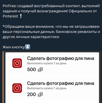 PinFree – телеграмм-бот, создатели которого заявляют о нем как об официальном приложении от Pinterest для выполнения заданий за деньги. Создатели обещают заработок в приложении PinFree на лайках, подписках и публикации контента. Никакой юридической информации о компании, стране регистрации или владельцах нет нигде.
