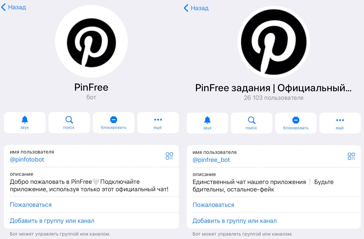 Параллельно с основным ботом обнаружены аналогичные проекты с похожими названиями: pinfree bot, pinfotobot, fotopinbot, pin37bot. Некоторые из них уже не работают, другие удалены. Это говорит о том, что схема тиражируется под разными именами, а отдельные версии закрываются по мере того, как набирают негативную репутацию.
