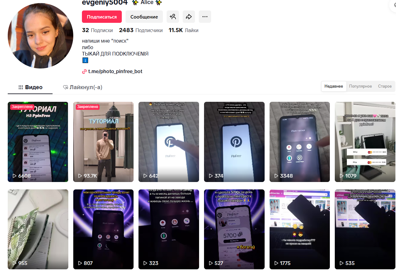 В TikTok много аккаунтов, которые продвигают приложение для заработка «ПинФри» через короткие видео: показывают интерфейс с якобы накопленным балансом, обещают легкие деньги и дают ссылку на бота.